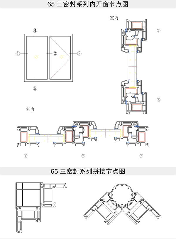 1、65系列主型材采用四腔結(jié)構(gòu),設(shè)有獨立排水腔、增強型鋼腔、保溫隔音腔,使熱傳導(dǎo)K值在2.0以下。
